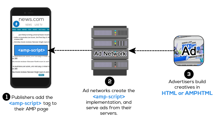 - When the user loads an AMP page, the <amp-script> tag sends an ad request to the ad network.