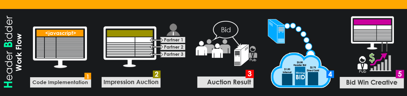 1. Publisher partners with a third party header bidding provider and implements the JavaScript code in the header of each page.