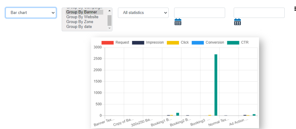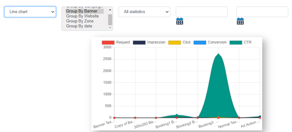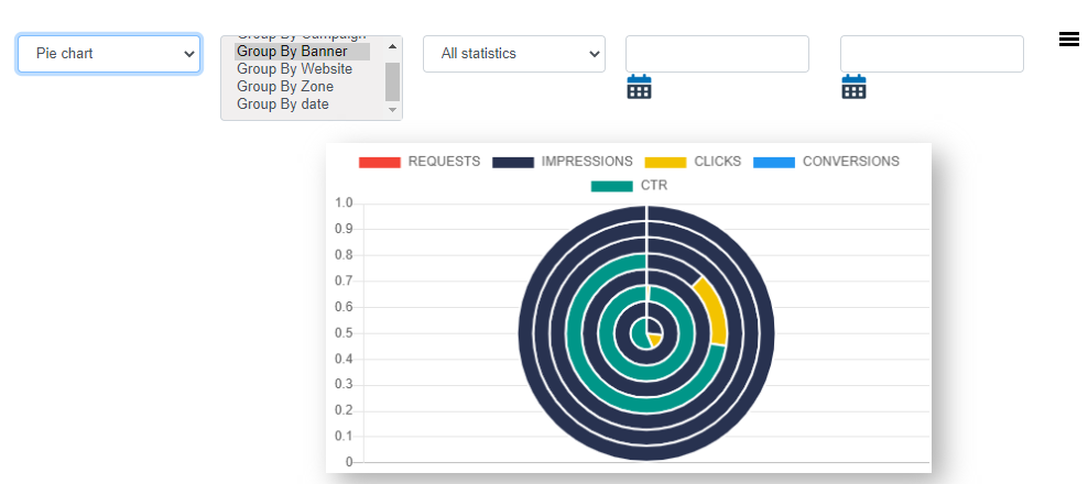 Filter By Date Picker, Type of Chart and Entity(Group By Campaign, Group By Banner, Group By Website, Group By Zone and Group By Date)