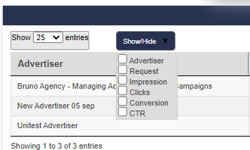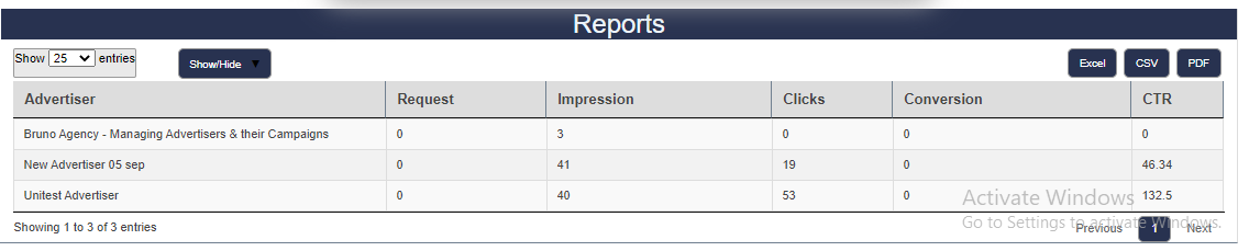 Data table contains the Entity name with Number of Requests, Impressions, Clicks, CTR and Conversions.