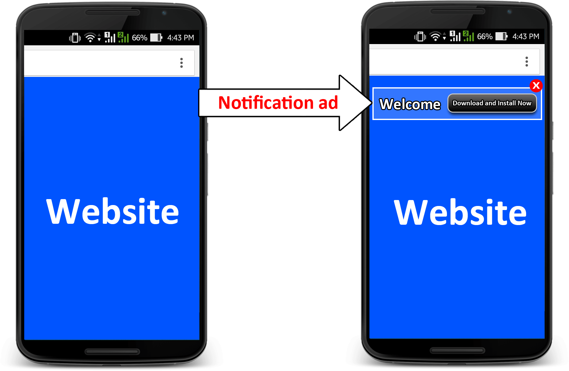 The plugin delivers notification creative when a user visits a publisher’s site on his mobile phone. When the user interacts with the ad and clicks on it, they will be redirected to the advertiser’s site.