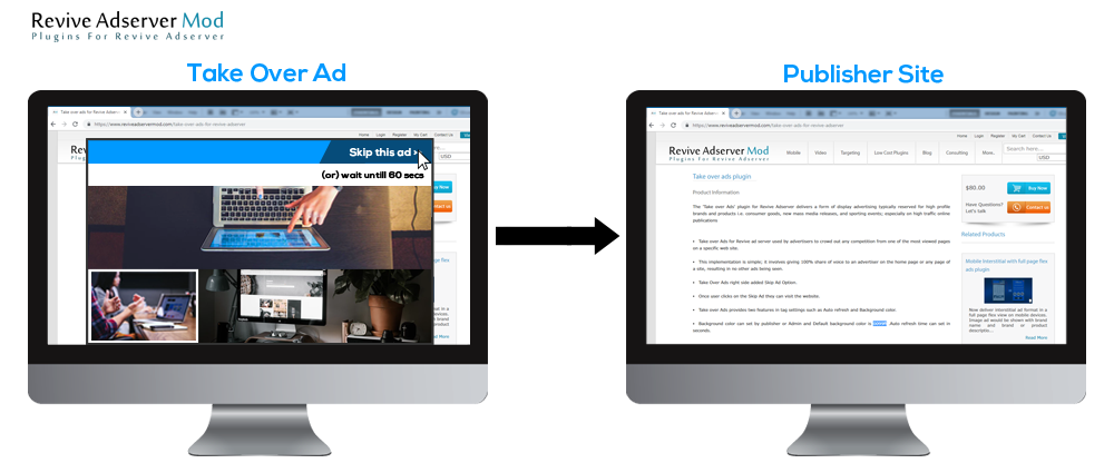 The 'Take-over Ads' plugin for Revive Adserver delivers a form of display advertising that literally covers up the whole screen on the publisher's site. These type of ads can be mosytly found on high profile brands, products and services such as consumer goods, new mass media releases, and sporting events; especially on high traffic online publications.