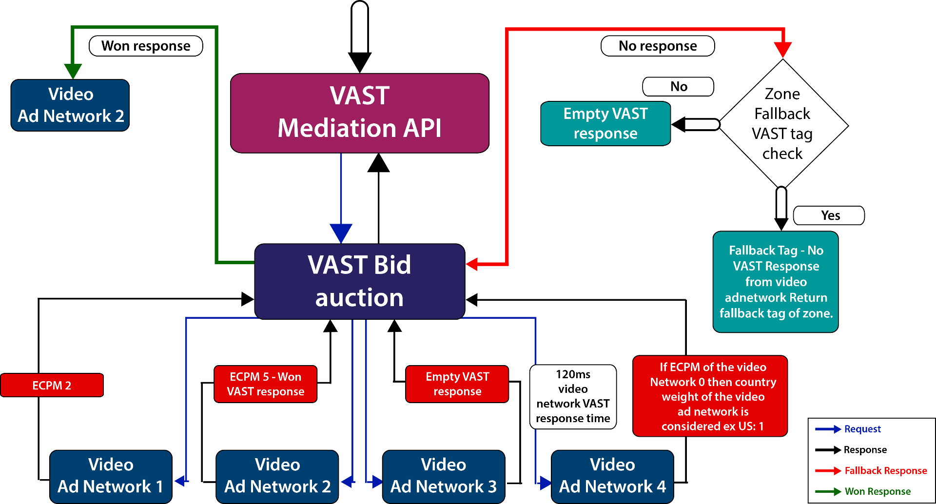 In case none of the video networks provide a valid response then a fallback response would be initiated from the VAST mediation API.